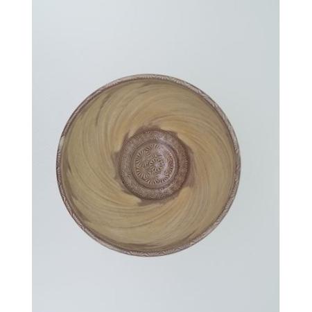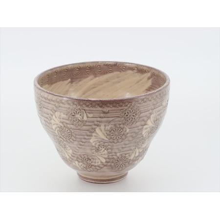 捻った印華紋に、内側の斜め刷毛目が相まって、リズム感のある抹茶?となっています。白泥の唐草紋が印象的。