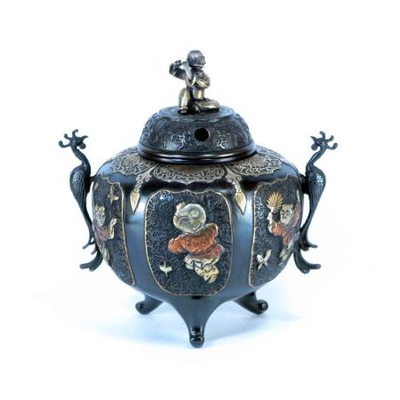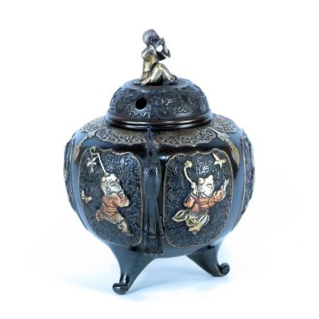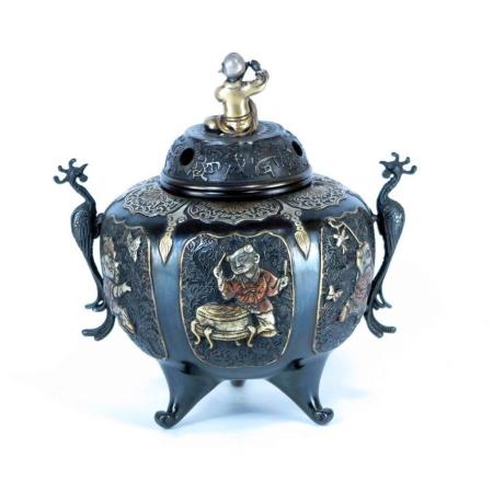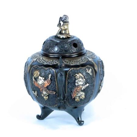 銅製 六面唐子遊び香炉 漆びきメッキ
