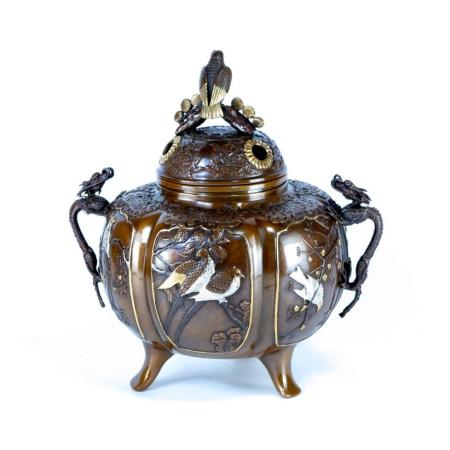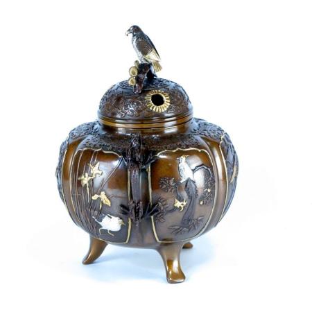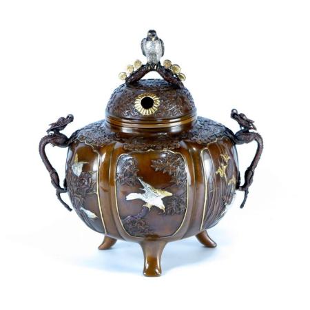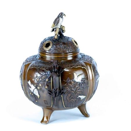 銅製 六花撰万葉香炉 煮色メッキ