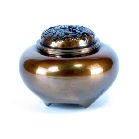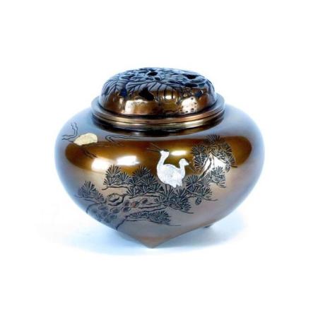 銅製  平型鶴巣象嵌入香炉 (金・銀張り)