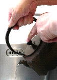 手順2蓋を外した鉄瓶を熱源の上に置き、乾燥させます。この時にその場を離れないで鉄瓶の底を観察していてください。20秒ほどで水の膜が消えて乾いてきます。底の乾いたところが多くなってきたら熱源を止めてそのまま30分程度おきます |