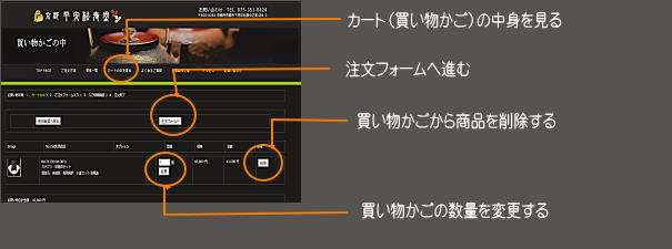 数量の増減は、カート(買い物かご)内で可能です。数量を変更して「変更」ボタンを押してください。 お買物を続ける場合は、一度「戻る」ボタンを押すと商品のページに戻ります。お買物が終了しましたら、カートの中(買い物かご)をクリックしご注文内容をご確認の上「注文フォームへ」ボタンを押してください。