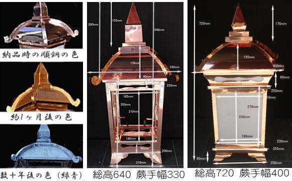 商売繁盛と吉祥を願う縁起物として、御商売各方面で今も愛され続けています。灯篭看板は、中真飾り、むくり屋根、下り棟、わらび先、鉢巻、ガラス灯窓、三味胴、袴飾りと銅版職人の最高技術と手間がかかった逸品であるとともに、商家の顔となるシンボルとなります。